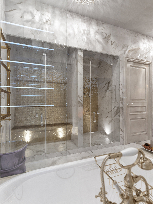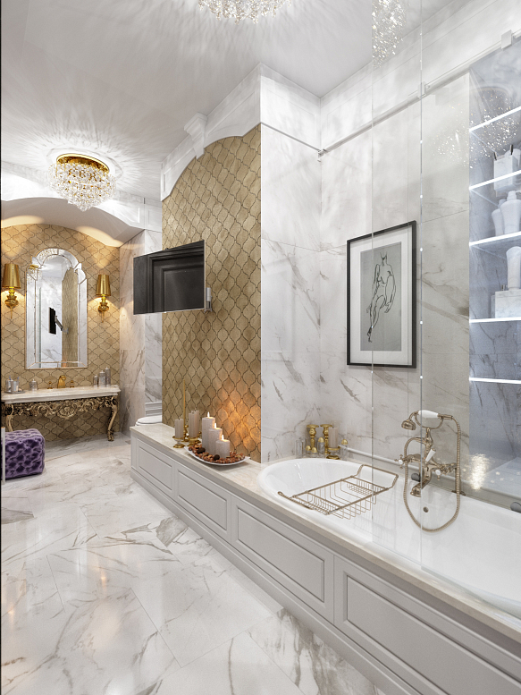 Использование лепнины и розеточных форм в декоре потолка - традиционный прием в классических интерьерах. Пол облицован мраморными плитами разных пород. Люстры ручной работы из муранского стекла и богемского хрусталя. Роскошное убранство подразумевает и высокий уровень комфорта, поэтому квартира оборудована системой "умный дом".