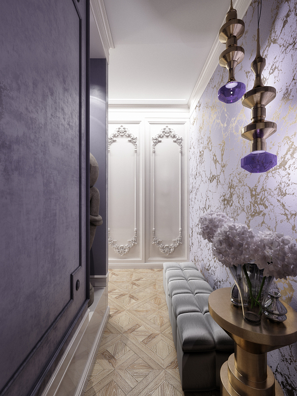 Выбранная тема оформления объединяет все помещения квартиры. В то же время у каждой комнаты и функциональной зоны свой собственный образ. Уютная гостиная и столовая составляют одно целое. Центром притяжения стал декоративный камин. Элегантная лепнина придала очагу особый шарм. Классическая стилистика дизайна поддержана декоративными элементами - карнизами. плинтусами и молдингами на стенах. Им соответствуют и двери. Оригинальная мягкая мебель, изготовленная из по эскизам дизайнеров, блестяще вписалась в стиль зоны гостиной. Комфортная и элегантная она выглядит по-королевски. В интерьере важно уделять внимание деталям без акцентного декорирования образ остается незавершенным. Колористическая палитра отвечает пристрастию хозяев к сиреневым оттенкам. Цветовую гамму дополнили парадный золотой и нейтральный белый.