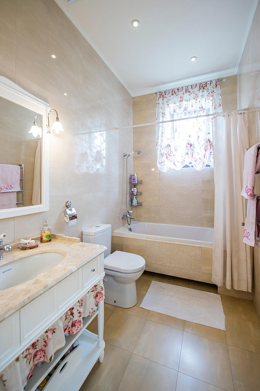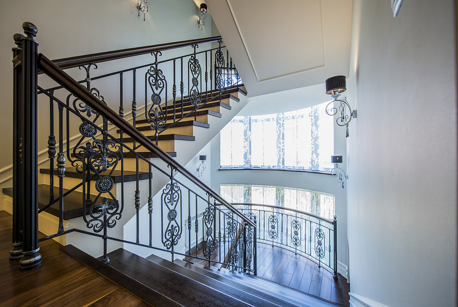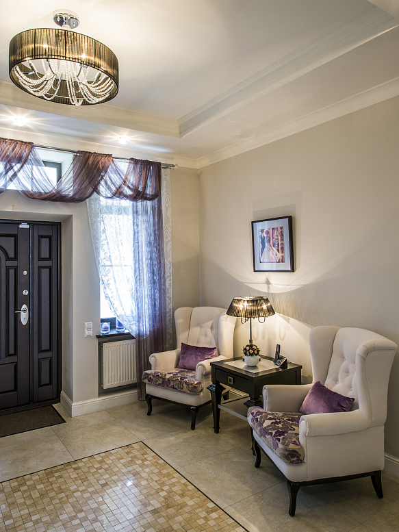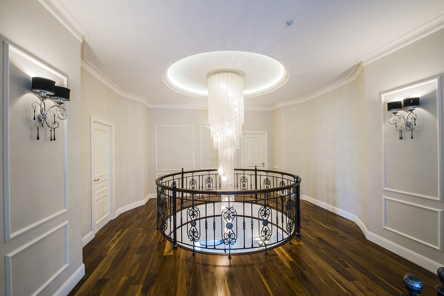 Главными характеристиками проекта стали комфортные открытые пространства со свободно перетекающими друг в друга функциональными зонами. Винтажные предметы обстановки, уникальные элементы декора, подчеркнули высокий социальный статус владельцев особняка. Выбранная палитра светлых оттенков, контрастирующая с благородными темными тонами натурального дерева, сделала дом торжественным и уютным одновременно. Один из главных атрибутов гостиной - облицованный мрамором камин. Несмотря на лаконичность форм и линий он олицетворяет собой классические традиции. Светскую салонность гостиной придает рояль, на котором играют владельцы дома.
